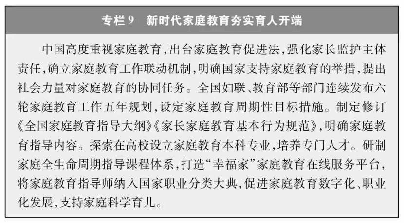 中国注重家庭家教家风建设,注重发挥妇女在社会生活和家庭生活中的独特作用,在弘扬中华民族家庭美德、树立良好家风方面的独特作用,不断完善支持家庭发展政策,提升家庭发展能力,为妇女享有更加美好的家庭生活创造积极有利条件。