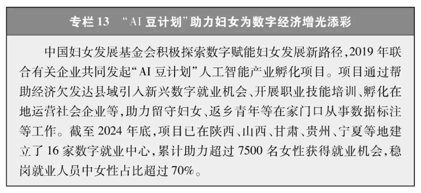在数字经济中绽放光彩。颁布提升全民数字素养与技能行动纲要、数字乡村发展行动计划,提出开展妇女数字素养教育与技能培训、发展巾帼电商品牌等措施。广大妇女适应数字时代要求,踊跃投身数字经济发展。2024年,共有14147名妇女取得人工智能训练师职业技能等级证书,占42.3%。互联网领域创业者中妇女超过一半。数字贸易、电商、直播等新业态就业者中妇女约占三分之一,数字经济性别红利不断释放。
