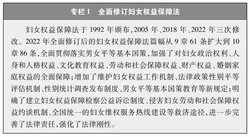持续完善法律体系。在深入推进全面依法治国进程中,一体推进妇女权益法治保障,构建起以宪法为基础、以妇女权益保障法为主体,包括100多部法律法规在内的法律体系。编纂民法典,“人格权编”进一步明确了性骚扰的定义和用人单位责任,“婚姻家庭编”完善了夫妻共同债务认定和清偿、离婚家务劳动经济补偿等制度。修改刑法,废除嫖宿幼女罪,以强奸罪论处,提高猥亵儿童罪的法定最低刑,加大对收买被拐卖妇女犯罪的惩治力度,新增负有照护职责人员性侵罪。修订妇女权益保障法,对妇女权益保障制度机制作出更加全面系统的规定。制定反家庭暴力法,明确了强制报告、告诫、人身安全保护令、临时庇护制度。修改农村土地承包法,完善对农村妇女土地权益的法律保障,让妇女实现“证上有名、名下有权”。制定农村集体经济组织法,从制度上保障妇女不因婚姻状况变动丧失农村集体经济组织成员身份和权益。法律援助法、基本医疗卫生与健康促进法、人口与计划生育法等,都设置专门条款保障妇女权益。国家层面和31个省(区、市)建立了法规政策性别平等评估机制,对与妇女权益密切相关的法律法规开展评估,促进从法律政策源头贯彻落实男女平等基本国策。