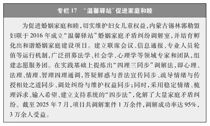 家庭友好型社会逐步建立。适应人口高质量发展和家庭发展需求,出台加快完善生育支持政策体系、推动建设生育友好型社会的若干措施。完善生育休假制度,各地普遍出台地方性法规,延长生育假期和男性陪产假,增设父母育儿假。实施3岁以下婴幼儿照护、赡养老人、子女教育个人所得税专项附加扣除政策。建立实施育儿补贴制度,逐步推行免费学前教育。鼓励用人单位建设“家庭友好型工作场所”,与职工协商采取弹性工作时间、居家办公等灵活的工作方式,帮助职工兼顾职业发展与子女照护,提供母婴设施,截至2024年底,全国有40.3万个已建工会企事业单位建立女职工休息哺乳室。在公共场所加强母婴设施配置,《民用建筑设计统一标准》《办公建筑设计标准》《铁路旅客车站建筑设计规范》均对设置母婴设施提出要求,截至2024年底,全国铁路车站建有母婴室1449个,全国高速公路服务区(含停车区)建有母婴室5371个,各地客船和港口客运站建有母婴室286个,年旅客吞吐量5000人次以上的运输机场全部配备母婴室,全国二级及以上汽车客运站建有母婴室2308个,城市轨道交通车站建有母婴室2599个。