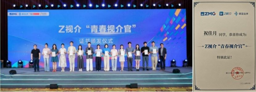 会上,浙江广电集团授予我校文化传播与艺术学院“蔚蓝金声&未来新主播研创基地”称号。我校播音与主持艺术专业2022级本科生祝佳月受邀入驻浙江广电集团人才孵化基地,获颁“Z 视介”青春视介官证书。她表示将以此为新起点,用足用好平台资源,在实践中成长,创作好作品,传递时代新声。