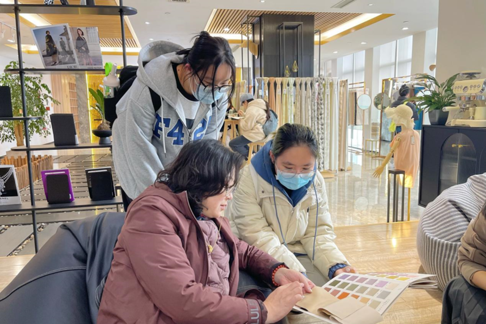 随后,师生们受到了绍兴纤谷纺织品有限公司的热情接待。考察团队在宽敞明亮的展厅中考察纺织面料和成衣样品,了解服装产业发展趋势,老师们及时答疑解惑,学生们拓宽了视野,提升了专业知识储备。下午,团队前往柯桥面料市场,重点对运动服装中吸湿排汗、速干、保暖、高回弹的材料进行了考察收集,种类繁多的面辅料样品让学生们兴奋不已,通过功能性面料的对比研究,加深了专业理解认识,为之后功能性服装的制作和毕业设计的材料择选找到了较为全面、专业的供应源。