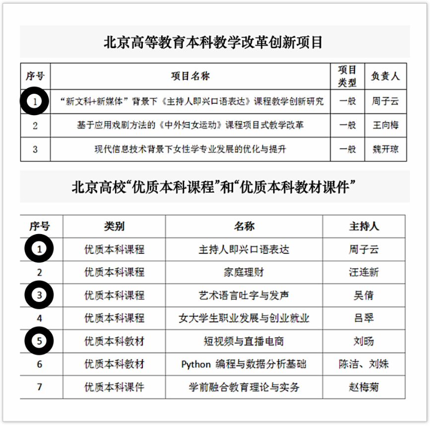 近年来,文化传播与艺术学院各专业在课程与教材建设上持续发力,在本科人才培养和教育教学改革上见实效,见成果。近日,北京市教育委员会公布了本科高层次教育教学相关评审的结果,我校共荣获13项成果,其中文化传播与艺术学院的周子云副教授、刘旸副教授、吴倩博士共获批北京市本科教学改革创新项目、北京市优质本科课程、北京市优质本科教材等共4项。