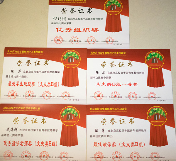 教师节前夕,北京高校第十届青年教师教学基本功比赛经过严格评审和公示,比赛成绩正式公布并为各高校颁发了证书。我校文化传播学院陆萍老师获得文史类B组一等奖,并获得最佳演示奖和最受学生欢迎奖,我校荣获优秀组织奖和优秀指导老师奖,这是我校连续参加六届北京市青教赛以来第五次取得一等奖的好成绩。