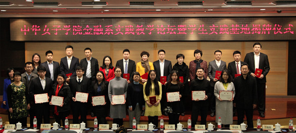 王练依次为中国银行北京亚运村支行、包商银行北京分行、北京东方华尔金融咨询有限责任公司、超赢投资管理(北京)有限公司、九州证券股份公司北京分公司、中信建投期货有限公司北京营业部、华福证券有限责任公司北京分公司、民生人寿保险股份公司北京分公司、中国太平洋人寿保险股份有限公司北京顾问营销部、泰康保险集团北京分公司、中国太平洋人寿保险股份有限公司北京顺义支公司等11家新签约的学生实践基地进行了揭牌。随后,王练、侯典牧和金融系副主任国晓丽一起为金融系首期聘任的24名校外导师颁发了聘书并合影留念。